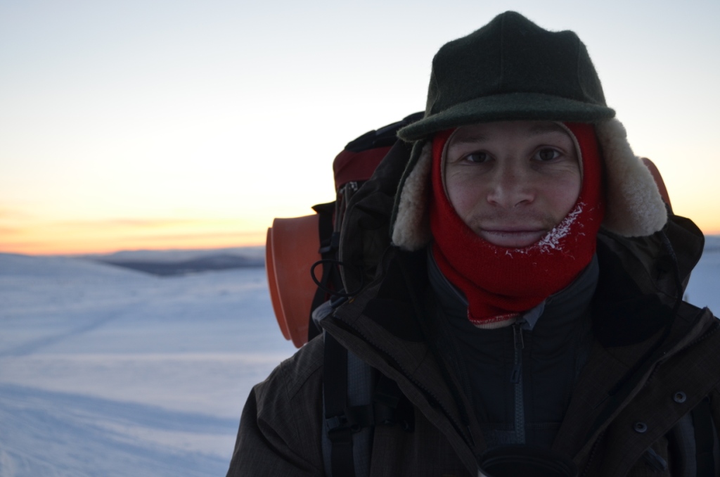 Appropriate clothing for -20F skiingThe skiing was beautiful, high mountains blanketed in thick snow rising to the west, marking the border with Norway. We quickly reached the tree line and continued on, though we doubted whether or not we were going the right way despite the occasional snowmobile (they are called “snowscooters” in Sweden) passing us. Finally, after 3 kilometers, dozens of snowmobiles started approaching us, coming down from the mountain, single-file, carefully pulling sleds with passengers nestled in reindeer hides, noses visible beneath thick fur hats. We spied OT and his uncle Per Ola riding together. The first time I met Per-Ola he was wearing thick green pants, a faded blue button up shirt with suspenders and a white hardhat, keeping himself busy with some task, whether reindeer or fish related. He is in his mid sixties, and is short and adorable, always chipper and smiling and an excellent crafter of duodji (sami handicrafts). Before we knew his name we simply called him “funny uncle.” Per Ola and OT told us we were almost there and that we could see about 6000 reindeer in the corral. Soon they would be driven down to the lower corral for the separation. Even though it was only about 1:30pm the sun was setting and we pushed on to see the herd.